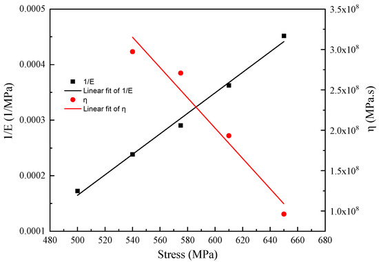 The relationship between , , and is linear fitted, and the curve is shown in Figure 10. Then, the curve equation of and with stress is obtained: