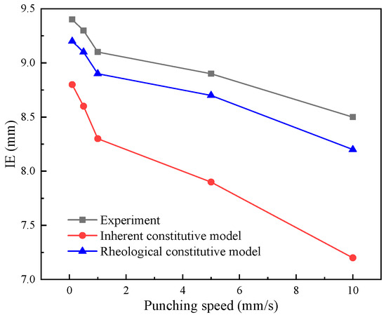 To simulate the cupping process of TRIP600, the Dynaform software 5.9.3 is utilized, and the IE value is recorded upon crack detection in the sheet. Initially, the software’s constitutive model is employed for simulation, followed by the utilization of the previously obtained rheological constitutive model for simulation. The results from both numerical simulations are summarized and compared with the experimental data, as depicted in Figure 11. As the set punch speed increases, the IE value gradually decreases, indicating an increase in forming difficulty. The simulation results obtained using the rheological constitutive model demonstrate closer agreement with the actual test data. When the software’s constitutive equation is employed for simulation, the deviation between the solution result and the experimental data is acceptable at lower punch speeds. However, as the punch speed increases, the deviation becomes unacceptably large, rendering the simulation no longer meaningful for reference purposes.