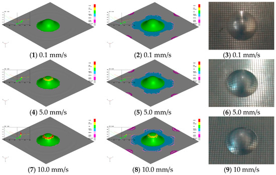 Simulation results of the cupping test at different punching speeds with the inherent constitutive equation (1,4,7) and the rheological constitutive equation (2,5,8), compared with the real experimental results (3,6,9).