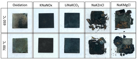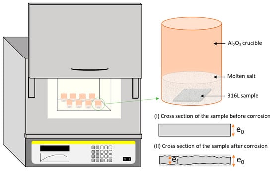 High-temperature corrosion tests were performed in a dry air atmosphere to simulate a punctual failure in the inertization system of a plant using LT 5/12/P330 furnace (Nabertherm GmbH, Lilienthal, Germany), following the standard ISO/FDIS 17224:2014 for high-temperature corrosion tests [36]. Figure 1 shows a scheme of the testing method employed for the corrosion tests; two samples were used for each studied condition. A short exposure time (48 h) was selected, also to simulate the punctual failure in the inertization system. In addition, two temperatures (650 and 700 °C) were employed. These temperatures were selected because the working temperature is expected to rise in the next generation of CSP plants and they are near the thermal stability limits of the employed carbonate-based and chloride-based salts, assuming that this temperature range is not ideal for the nitrate/nitrite-based salts as it is higher than their stability limit.
