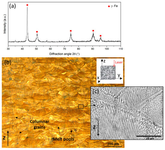 The composition of the 316L ss was 17.0 Cr, 13.1 Ni, 2.7 Mo, 1.3 Mn, 1.2 Si, and bal. Fe (in wt.%). XRD spectrum of the 316L stainless steel manufactured through L-PBF is shown in Figure 2a. The pattern shows that the sample was characterized only by the FCC austenite phase (00-003-1209, ICDD).