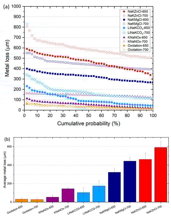 High-temperature corrosion behavior of L-PBF 316L stainless steel in the presence of different TES molten salts at 650 and 700 °C for 48 h: (a) metal loss (in µm) vs. cumulative probability (in %) and (b) average metal loss results (data of NaKZnCl samples from Ref [24]).