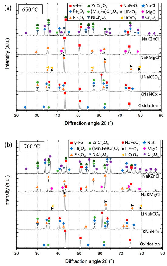 Figure 5 shows the XRD patterns of the tested samples at 650 °C, Figure 5a, and 700 °C, Figure 5b, and Table 2 shows a list of the XRD-identified species to facilitate the analysis of the results. According to the visual examination shown in Figure 4 of the samples exposed to high temperatures in the absence of molten salts, the prominent peaks were those of austenite γ-Fe; however, some small peaks of hematite (Fe2O3) and spinel ((Mn,Fe)Cr2O4) oxides were also identified at both tested temperatures.