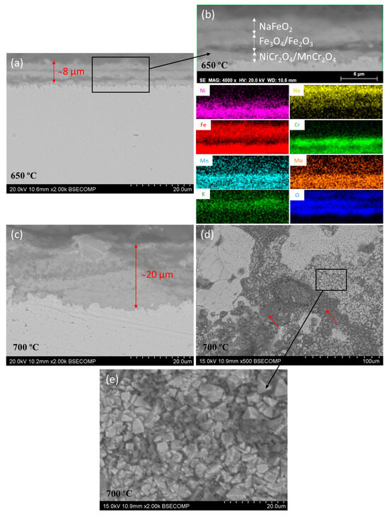 Figure 6 shows the SEM analysis of the cross-section of the L-PBF 316L ss exposed to 650 and 700 °C without any molten salts. The microstructure of the grown oxide layer was extensively characterized in a previous study [24]. It was formed of a homogeneous coating of ~6 and ~9 µm thickness on the samples tested at 650 and 700 °C, respectively, and it was composed from the inner to the top surface of MnCr2O4, Fe2O3, and FeCr2O4. In addition, the oxide layer adhered well to the substrate; no delamination or cracks were observed in the substrate–oxide interface, as Figure 6c shows at higher magnification for the L-PBF 316L stainless steel exposed at 700 °C for 48 h.