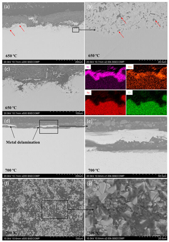 Figure 8 shows the SEM micrographs of the L-PBF 316L stainless steel exposed to carbonate-based (LiNaKCO3) molten salts at 650 °C (Figure 8a–c) and 700 °C (Figure 8d–g) for 48 h. The continuous oxide layer shown previously using the KNaNOx salt was not observed, but the degree of corrosion was slightly superior at 650 °C, Figure 8a. In addition, Figure 8b shows at higher magnification that the area near the surface was porous and full of cavities and holes (marked with red arrows in Figure 8a,b). These vacancies were left by the depletion of some elements, thereby forming diffusion paths [49]. The formation of these diffusion paths during the high-temperature corrosion process can be attributed to unbalanced diffusional processes known as the Kirkendall effect. In this area, the main elements of the alloy (Fe and Cr) were not present, as the EDX mappings of Figure 8c revealed. In contrast, this area was enriched in Ni and Mo. Otherwise, the presence of Li could not be detected through EDX (it is important to consider the low sensitivity of EDX to light elements), but some Li-rich phases, such as LiFeO2 and LiCrO2, were detected with XRD, as shown in Figure 5. The high activity of Li ions in the molten salt produced their reaction with Fe and Cr-rich oxides, forming Li-rich compounds (LiFeO2 and LiCrO2) following reactions (3) and (4). LiCrO2 has a higher solubility than LiFeO2 in the molten carbonate salt; therefore, a stable LiFeO2 layer gradually formed on the top.