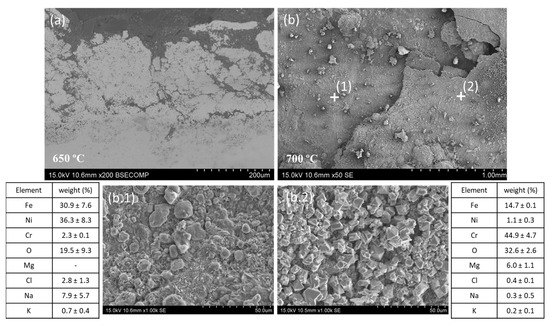 SEM/EDX characterization of the L-PBF 316L ss exposed to the NaKMgCl TES material for 48 h at (a) 650 °C and (b) 700 °C.