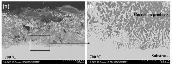Cross-sectional SEM analysis of the L-PBF 316L stainless steel exposed to the NaKZnCl TES material at 700 °C for 48 h at (a) ×300 and (b) ×2000 magnification.