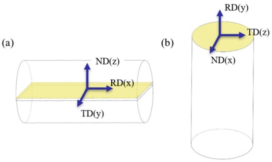 The microstructural orientation features of the deformed specimens were analyzed using electron backscatter diffraction (EBSD). The preparation of EBSD samples involved mechanical polishing like metallographic samples. After mechanical polishing, the specimens were subjected to vibratory polishing using a silica polishing fluid at a frequency of 62 Hz for 8 h. The vibratory-polished specimens were cleaned in an ultrasonic cleaner, wiped with cotton soaked in flowing water in the direction of the water flow, and then rinsed with anhydrous ethanol and blown dry to complete the EBSD sample preparation. The EBSD analysis was performed using a ZEISS Sigma 300 field-emission scanning electron microscope, (Carl Zeiss AG, Dublin, CA, USA) and the cross-sections of the deformed samples analyzed included longitudinal and transverse sections, as shown in Figure 1.