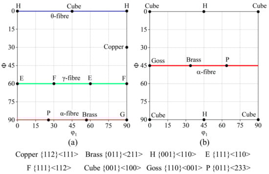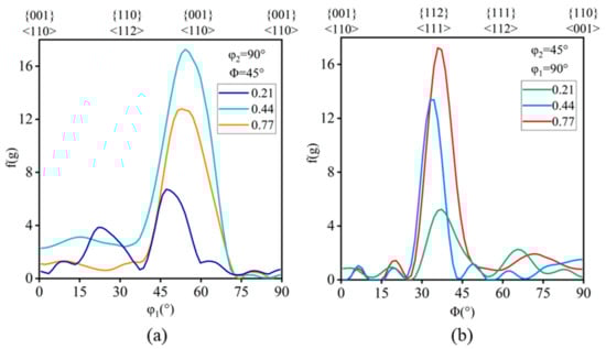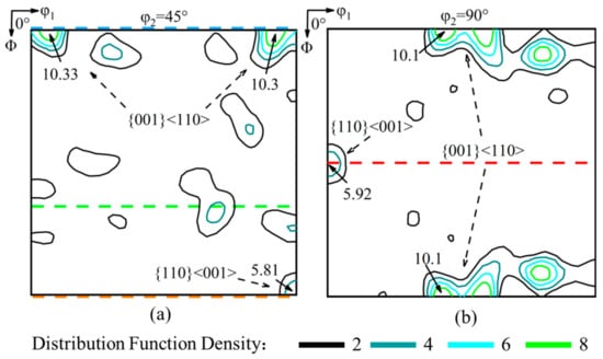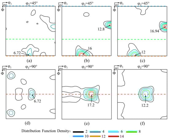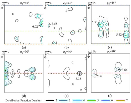 In EBSD data analysis, to quantitatively analyze the texture components, the distribution of the orientation distribution function (ODF) in the orientation space composed of Euler angles (φ1, Φ, φ2) is an important basis for determining the texture. The orientation space is composed of three Euler angles with a value range of 0°–90°, and most textures are distributed on the φ2 = 45° section and the 90° section. Therefore, this paper mainly analyzes the texture components on two sections. Figure 2 shows the texture distribution on the two sections, and the analysis data are processed using ATEX V2.08 [] and Channel 5 V2007 software.