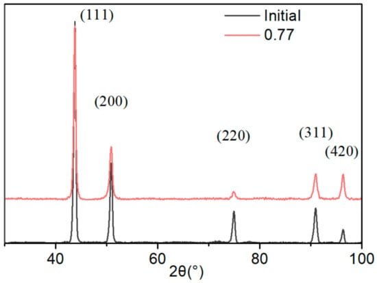 The initial microstructure of the alloy was obtained through heat rotary forging and annealing. According to the literature [], precipitates were observed in some heat-treated MP35N alloys. Therefore, XRD analysis of the alloy was performed, and Figure 3 shows the XRD patterns of the alloy under different processing conditions. The indices corresponding to each diffraction peak indicate that the MP35N alloy has an FCC structure with a lattice constant of 3.58 Å, which is close to that of metallic nickel (3.52 Å), suggesting that it is a solid solution formed by other elements dissolved in the nickel lattice. This indicates that the initial and plastic deformation microstructure of the MP35N alloy is a single-phase structure without precipitates [].