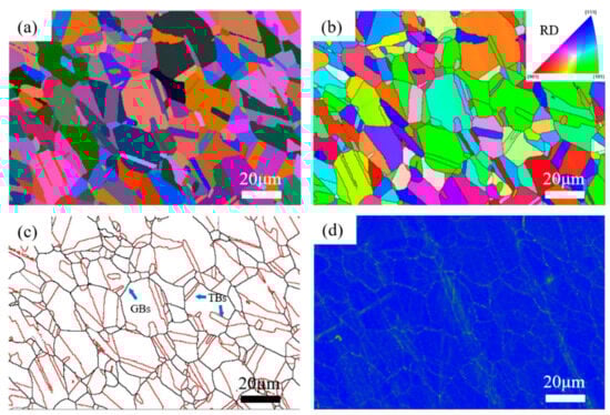 Initial organization EBSD chart (a) Euler angle image; (b) IPF diagram in RD direction; (c) grain boundary (GB) and twin boundary (TB); (d) misorientation map.
