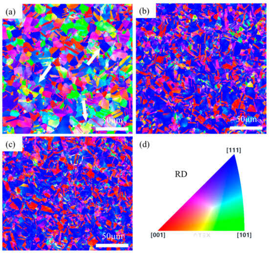 During the cold-drawing process, the alloy grains rotate with deformation, and the degree of rotation or elongation of the grains towards a certain direction increases with the increase in deformation. Figure 6 shows the imaging of the microstructure of alloys with different deformation amounts parallel to the RD direction. Compared with the initial structure, the orientation of the deformed structure has undergone significant changes. When the strain is 0.21, the proportion of [111]//RD orientation is 23.83%, and the proportion of [001]//RD orientation is 10.72%. Compared with the initial structure, the number of grains with these two orientations increases, while the grains with [101]//RD orientation decrease. The region pointed by the arrow in Figure 6a also shows significant orientation changes within a single grain, indicating the existence of inhomogeneous deformation within a single crystal. Figure 6b shows the orientation of the texture at a strain of 0.44, where most of the texture orientation is [111]//RD, accounting for 49.64%, and the proportion of [001]//RD orientation is 16.91%, which decreases. That is, a strong [111]//RD and a weak [001]//RD texture are formed. Although the strain increases by 0.33 from 0.44 to 0.77, the texture does not change significantly, and the proportion of [111]//RD orientation is 48.59%, and the proportion of [001]//RD orientation is 15.90%, which is slightly lower than that of the 0.44 strain, indicating that in further deformation process, the crystals no longer rotate but mainly elongate, resulting in smaller grain size on the cross section, increased fragmentation in local areas, and more complex crystal orientations in the fragmented area.
