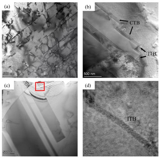 TEM diagram of initial state structure of (a) dislocation patterns; (b) annealed twin; (c) another annealing twin; (d) annealed twin incoherent twin boundary (ITB) in subfigure (c).