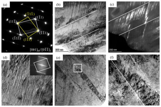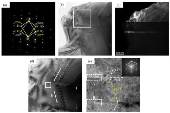 Figure 13 shows the TEM image of the 0.44 strain sample. In the bright-field image, a lot of twinned crystals have a consistent twinning direction and eventually terminate at the grain boundaries. The average width of the twinned crystal layers in Figure 13c is 15 nm, and the gaps between the micro-twins are high-density dislocation clusters, which are distributed non-uniformly. In another region in Figure 13d, the diffraction spots corresponding to high-index crystal planes rotate counter-clockwise as a whole, indicating that the stress is high in this area, causing severe lattice distortion, and the deformed twins are not in complete lattice coherency with the matrix. Moreover, the twinned spots are not perfectly circular but elongated into elliptical shapes, which are the diffraction patterns formed by a lot of stacking faults. These stacking faults can be regarded as extremely thin twinned boundaries in a face-centered cubic crystal, and a full dislocation can be decomposed according to Venables’ twinning polar mechanism as follows []: