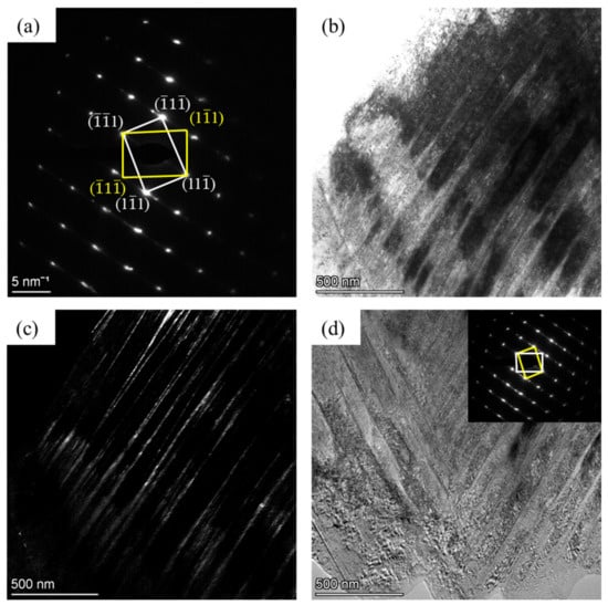 ε = 0.44 TEM micrograph (a) selected area electron diffraction pattern of crystal belt axis <011>; (b) bright-field image; (c) twin dark-field image; (d) another area bright-field image and corresponding selected area electron diffraction pattern.