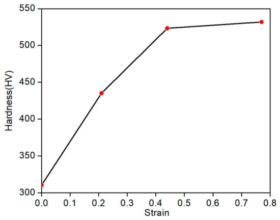 With the increase in strain, the deformation mechanism of cold-drawn MP35N alloy changes from dislocation slip to twin. The density of dislocation and micro-twins is greatly increased, resulting in a strain hardening effect. Figure 15 shows the variation curve of alloy microhardness with stress variables. The hardness of the alloy increases from the initial 310.9 HV to 435.1 HV when the cold-drawing amount is small, which is due to the large proliferation of dislocation resulting in hardening. It can be seen from the microstructure that both grain boundary and annealing twin boundary may be the source of dislocation, and because of the presence of annealing twins, the interface has a stronger hindering effect on dislocation, so the hardening effect is more significant than that of low strain. When the strain variable reached 0.44, both dislocation and twins proliferated, a large number of slip bands was observed in the metallographic structure, and the microhardness was further enhanced. Compared with 0.44, the strain of 0.77 had a smaller increase in hardness, and a large number of dislocations appeared in the structure, and the deformation mechanism changed to be mainly twinning. However, the hardening effect of twins is lower than that of dislocations, and the twin regions are mostly located in high-density dislocation regions, which already exist at the strain variable of 0.44, so the microhardness is only increased by 8.6 HV [].
