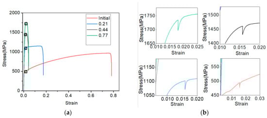 As shown in Figure 16, the tensile stress–strain curve of the initial alloy has a yield point of 2.12, and there is an obvious yield point. After a certain strain, there is already a stress in the alloy itself, and such stress increases with the increase in the strain variable, and the dislocation can only be started under greater stress. Therefore, the stress–strain curve of the alloy after cold drawing with a strain variable of 0.22 has not activated the new dislocation after reaching yield, and still maintains the characteristics of the approximate elastic stage. It does not enter the plastic deformation stage until about 1100 MPa, when the movable dislocation and dislocation source are activated in large quantities. However, its strength only increases by tens of MPa before it breaks. If the engineering stress is transformed into true stress, the true stress increases greatly. This characteristic is similar to that of alloys with general stress–strain curves after unloading and reloading after reaching a certain shape, where the yield strength increases and the plasticity decreases. This feature is more obvious in the stress–strain curves of alloys after cold drawing with strain variable of 0.44 and 0.77. After cold drawing with strain variable of 0.77, the plasticity of alloys is almost the same as that of alloys with strain variable of 0.44, but the tensile strength is increased by 261 MPa, mainly because the deformation mechanism has changed into a twinned one. Twinning shear requires greater stress to proceed, while plasticity remains the same as 0.44 due to twinning.