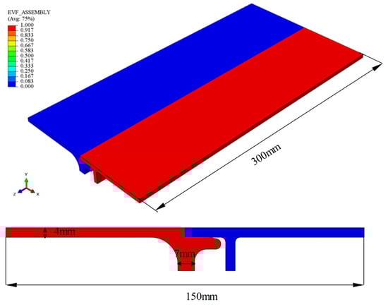 The local finite element model of the butt–lap joint was established by Abaqus 2021 to simulate the hook defects of AA6005-T6 aluminum alloy in the process of FSW. In the CEL model, the entire workpiece model is initially created and set as a Eulerian body. It is then divided into two parts, with each part being assigned specific material properties. The contact between these two parts is modeled using the general contact approach to simulate the interactions between them during the actual welding process. The size of the workpiece is 300 × 150 mm and the thickness is 4 mm. The Eulerian partition is shown in Figure 1.