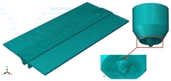 The material region was meshed using eight-node thermally coupled Eulerian elements (EC3D8RT). In order to optimize computational efficiency, the material region welding area is discretized into a finer element (1 mm), while the remaining area is divided into a coarser element (4 mm), resulting in a total of 400,000 elements, as shown in Figure 2. The tool is divided by a four-node thermally coupled tetrahedral element with a global mesh size of 1 mm and a probe mesh size of 0.2 mm and a total of 340,712 elements.