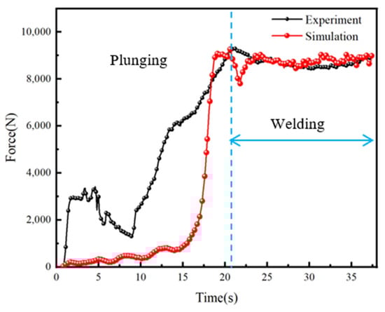 Figure 3 presents axial force data obtained through numerical simulations and experiments under a welding speed of 2000 RPM and a travel speed of 1500 mm/min. The good agreement between the two curves demonstrates preliminary validation of the model. At the beginning of welding, the axial force rapidly increases as the probe initially comes into contact with the cold workpiece. As the tool rotates at high speed, the temperature in the welding area increases, causing the material in the stir zone to soften and the axial force to decrease. At t = 17 s, the tool is fully inserted into the workpiece. The shoulder begins to make contact with the surface of the workpiece and moves downward, increasing the contact area and, thus, the axial force rises again. By t = 20 s, as the tool moves forward, the welding enters a steady phase, and the axial force stabilizes, fluctuating around 9000 N. To compare the experimental and simulation results, we specifically focused on two key aspects: the morphology of the weld nugget and the size and shape of the hook defects at the lap interface. By precisely measuring the cross-sections of the welded joints in experiments and comparing these with the simulation results, we validated the effectiveness of the model. This is the first time numerical simulation methods were used to present the morphology and size of hook defects. The comparison results show that the existing model can accurately describe the shape of the plastic deformation zone, as well as the size and deflection direction of hook defects. The error between the simulation results and the experimental results is only 10.2%, as shown in Figure 4. The black lines at the plastic deformation zone and the lap surface represent the boundary of the Euler domain, showing the deformation of the material in the Euler domain.
