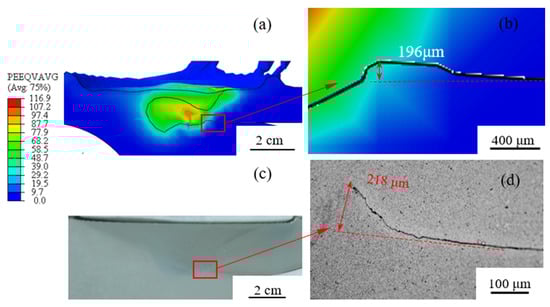 Comparison of the simulated hook size and the experimental results. (a) Simulation result of hook defects. (b) Partial enlarged view of hook defects simulation results. (c) Hook defects experimental results. (d) Partial enlarged view of hook defects experimental results.