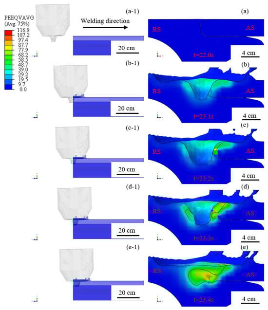 To demonstrate the continuous deformation process of the lap interface, the welding process of a certain cross-section in the model is divided into five different moments to observe the evolution of the lap interface pre- and post-welding. The formation process of the hook defects during the welding procedure is illustrated in Figure 5. Figure 5a–e shows the continuous evolution of the lap interface at different moments, while Figure 5(a-1)–(e-1) illustrates the relative position of the probe and the cross-section at different moments. The tool rotates counterclockwise, with the advancing side positioned on the lap surface. In the initial state of welding (t = 22.0 s), the lap interface does not initially make contact with the probe, and the lap surface is a flat straight line, as shown in Figure 5a. At the second moment (t = 23.1 s), the root of the probe makes contact with the material. At this time, the butt interface disappears and the lap interface near the plastic deformation zone noticeably bends upward, while the distant lap interface remains flat, as shown in Figure 5b. At the third moment (t = 23.2 s), the entire probe is in contact with the material, and the plastic deformation zone expands. The lap interface in the stir zone disappears under the action of the probe, while the lap interface at the edge of the plastic deformation zone exhibits an upward-bent shape, as shown in Figure 5c. At the fourth moment (t = 23.3 s), the upward bending degree of the lap interface near the plastic deformation zone increases further, as shown in Figure 5d. At the fifth moment (t = 23.0 s), the probe completely passes through the lap surface. The degree of upward bending of the lap interface located at the edge of the plastic deformation zone on the forward side continues to increase, while the distant lap interface remains flat, as shown in Figure 5e.