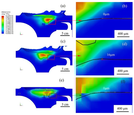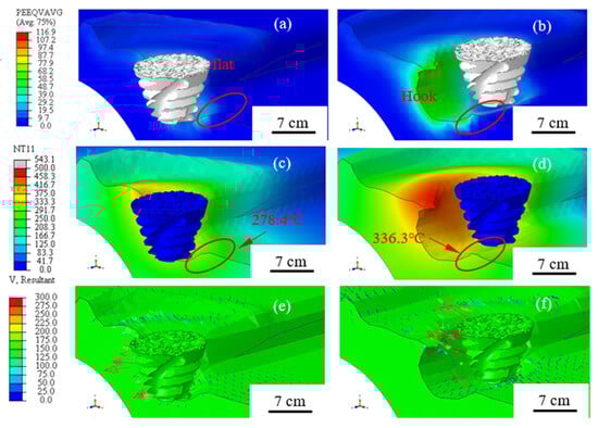 In order to investigate the causes of hook defects, the formation mechanism of hook defects was studied through numerical simulation, as shown in Figure 6. As depicted in Figure 6a,b, before the probe comes into contact with the lap surface, the lap interface in front of the probe remains flat; when the probe passes through the lap interface, the lap interface behind the probe undergoes plastic deformation and forms hook defects. The effects of temperature and force on the plastic metal are two factors that generate hook defects. Before the probe passes through the lap surface, the highest temperature at the lap interface is 278.4 °C, and after the probe passes through the lap surface, the highest temperature at the interface reaches 336.3 °C, as shown in Figure 6c,d. However, temperature is not the most fundamental factor affecting the generation of the hook. This is because the increase in the material’s temperature will only significantly reduce its yield stress; it will not cause plastic deformation of the material. The force driving the plastic metal is the main reason for the production of the hook. Before the probe passes through the lap interface, the plastic metal in front of the probe flows from the advancing side (AS) to the retreating side (RS) under the action of the probe, as shown in Figure 6e. When the probe passes through the lap interface, a large amount of plastic metal behind the probe is forced to move from the upper part of the retreating side to the bottom of the advancing side under the action of the probe (the red arrow part in the figure), and the lap interface naturally flows upward under the extrusion of the probe (the red circle part in the figure) to form the hook defects, as shown in Figure 6f.