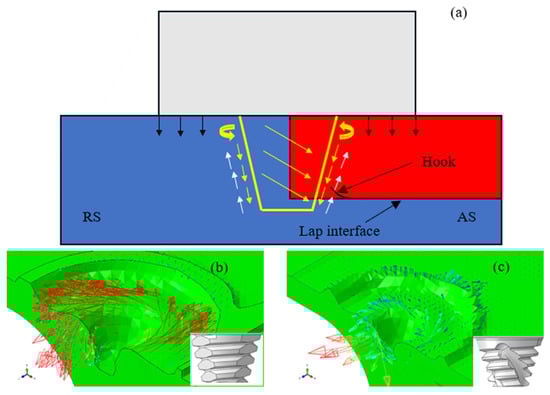 During the FSW process, the friction and stirring action between the tool and the workpiece generate heat, which softens the metal. The rotation of the tool induces the flow of plasticized metal. Figure 7a shows the direction of plastic metal flow at the cross-section of the joint. The plastic metal flow at the bottom of the lap interface is divided into two parts: in the shoulder action area, the plastic metal flow first rotates around the shoulder and then flows downward around the probe, pushing the plastic metal flow into the probe action area; under the compressive force of the probe and shoulder, the plastic metal flow in the probe action area moves downward and concentrates at the bottom of the weld zone. As the FSW process progresses, the accumulated amount of plasticized metal at this location increases, as does the pressure. Therefore, the lower layer of plastic metal flow tends to move upward and then forming hook defects.
