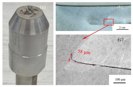 During the welding process, the tool’s tilting angle was 2.5° and the shoulder plunge depth was 0.2 mm. Welding parameters included a rotational speed of 2000 rpm and a translational speed of 1500 mm/min. Post-welding, the metallographic samples were taken in the direction of the vertical weld by an electric spark cutting machine and the metallographic samples were polished and etched with Keller reagent (2 mL HF + 3 mL HCl + 5 mL HNO3 + 190 mL H2O) to prepare metallographic specimens. Optical microscopy was used to observe the interface defects morphology of the butt–lap joint, and the heights of the hook defects were marked. Axial force data during the welding process were collected every 0.1 s by a sensor integrated into the equipment.