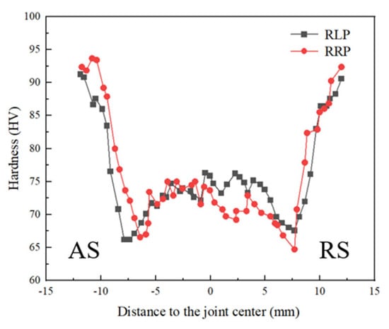 Figure 11 illustrates the microhardness distribution on the cross-section of butt–lap joints under the same parameters using RRP and RLP. The hardness of the joints significantly softened, displaying a typical W-shaped hardness distribution across the joint. The lowest hardness values were found on the retreating side, with the lowest microhardness in the heat-affected zone being only 64 Hv. The hardness was relatively higher in the base metal, but there was a significant decline as it transitioned towards the weld zone, across both the thermo-mechanical-affected zone and the heat-affected zone, followed by a recovery in hardness within the weld zone. This pattern arose because the grains in the heat-affected zone underwent growth due to the high-temperature thermal cycles, while some grains in the thermo-mechanical-affected zone recrystallized due to the compressive action of the plastic metal, resulting in a mixed grain size in this area and severe grain deformation. These microstructural changes led to a substantial decrease in the strength and hardness of the joints. The grains in the weld zone underwent recrystallization due to the intense stirring action of the probe, resulting in grain refinement, thereby improving the strength and hardness to some extent.