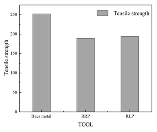 Figure 12 presents the tensile shear results for butt–lap joints made of 6005A-T6 aluminum alloy. The tensile strength of the parent material was 252 MPa. The joints using the RRP achieved a tensile strength of 189.27 MPa, which is 75.1% of the base metal’s strength; meanwhile, joints using the RLP showed a tensile strength of 194.06 MPa, reaching 77% of the base metal’s strength. The reduction in the size of hook defects led to an improvement in the tensile strength of the joints.