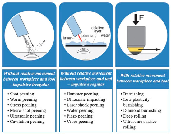 Surface plastic deformation techniques, or mechanical surface enhancement techniques (MSETs), are recognized to be fast, clean, easy, and economical along with comparable surface properties among the available options [15]. MST/s involve a physical interaction between a tool and workpiece, which induces localized elastic–plastic deformations in the surface/near surface regions. This renders characteristic alterations in surface properties, which imparts strength and fatigue resistance to subsurface regions. However, the beneficial effects of MST/s prevail only if the modified surface properties are stable under cyclic loads and at elevated temperatures. A general classification of MST/s is presented in Figure 1, which mainly depends on movement between the workpiece and tool. Relative movement between the workpiece and tool comprises the burnishing and rolling process, whereas no relative movement between the workpiece and tool comprises the different peening process, as shown in Figure 1 [15,16].