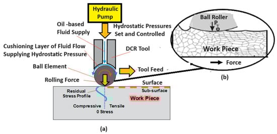 Deep rolling (DR), or alternatively, deep cold rolling (DCR), is a mechanical surface treatment process adopted to convey a mirror finish to the surface and to induce a tailored microstructure, beneficial residual stresses, and cold work on the metal surface and near-surface regions with the help of a ball or roller end tool. The magnitude and stability of the induced surface/subsurface modifications through DR play a crucial role in improving the fatigue strength of a metal. It is an effective alternative to enhance the durability and surface hardness of a metal along with reducing the notch effect caused by surface microcracks. Moreover, deep rolling eliminates the need for costly and time-consuming secondary finishing processes such as polishing, grinding, plating, and surface heat treatments. It is a cost-effective technique when compared with other commercially available surface treatment techniques because of simpler tooling and processing on standard machines [17,18,19,20]. However, the use of this technique is limited to components with certain geometries or shapes owing to its working principle, and it is not suitable for components having significant variation in geometrical profiles, especially with thin walls and intricate areas with low tool accessibility. The working principle of the DR process is illustrated in Figure 2 [18,19].