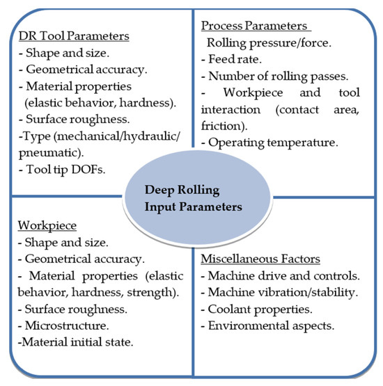 The specimen’s surface is rolled over by a ball or roller. The deep grooves or sharp indentations on the surface are reduced by the ball’s rubbing action, improving the surface finish. A plastic zone and a longitudinal groove are formed when the ball makes contact with the workpiece surface. The surface and near-surface regions up to a defined depth are plastically deformed, which encloses an elastically deformed core. Upon the separation of the ball, the recovery of the elastic zone creates large residual compressive stress on the surface. Significant compressive depth and cold work in about 1 mm (material-dependent) and directional strength enhancement (rolling direction-dependent) can be achieved [14,15]. In general, the operation of deep rolling can be realized through two motions as follows: (a) immersing or pressing the roller or ball (which is free to revolve about its own axis) against the workpiece with a pre-determined force and (b) rotating workpiece on the lengthwise axis (for cylindrical parts) or in-plane translations (for flat parts). The numerous controlling parameters illustrated in Figure 3 show the deep rolling process and, consequently, the near-surface properties [23]. Therefore, identifying the optimum combination of these control parameters is crucial for achieving desirable surface property enhancement.