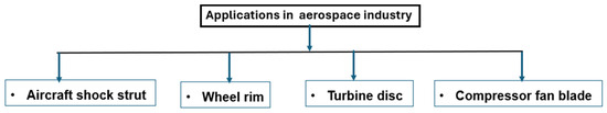 In aerospace applications, the major objective of designers is to minimize weight without compromising strength. DR, which provides notable surface/subsurface properties, is known to be the potential solution to achieve these objectives [12]. Typical examples shown in Figure 6 include heavily loaded structural parts like bolts and struts, propulsion parts like turbine discs, compressor rotor blades, transmission parts like landing gears, military aircraft wheel rims, etc. [8,24].