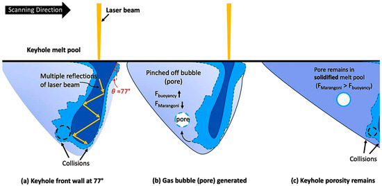 Keyhole porosity occurs during keyhole melting when the material vaporizes and becomes trapped inside the molten area [2,31,32,33]. This phenomenon is highly correlated with processing parameters. It is important to note that not all instances of keyhole melting result in porosity. The formation mechanism of the keyhole is illustrated in Figure 1. Keyhole porosity has been extensively investigated in the literature under various material and processing conditions. Researchers have studied its formation mechanisms, the influence of different laser parameters (such as power, speed, and beam quality), powder characteristics, and environmental factors on the occurrence and characteristics of keyhole porosities [2,22,27,28,34,35,36,37,38]. These studies aim to improve the understanding of keyhole porosity formation and develop strategies to minimize or eliminate its occurrence in laser-based additive manufacturing processes.