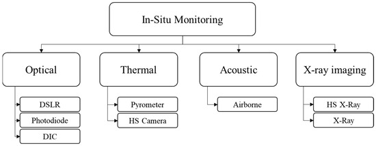 Grasso and Colosimo [7] and Grasso et al. [44] elucidated the in situ monitoring of powder bed fusion (PBF) samples, wherein the authors explicated and demonstrated levels of in situ monitoring systems tailored for PBF processes. Level 1 is characterized by the monitoring of irregularities in the powder bed, which may result in porosity and/or insufficient fusion [44,45,46,47,48]. The subsequent level is defined as the measurement of quantities with higher temporal resolutions, encompassing the observation of the interaction between the beam and material, the thermal history of the process, and the examination of by-products such as spatters and plume emissions [49,50,51]. Moving to Level 3, the focus shifts to observing the melt pool, a pivotal aspect for achieving local fusion of the material within the PBF process [52,53]. The final level involves the collection of information pertaining to phenomena occurring in the current layer. This includes employing techniques such as X-ray imaging, ultrasound, and the monitoring of acoustic emissions caused by elastic energy and plastic deformations in the solidified material [54,55,56]. While the aforementioned approaches are specific to PBF, many of these techniques are also applicable to metal L-PBF. These techniques can be categorized into optical, thermal, acoustic, and X-ray-based in situ monitoring methods, as illustrated in Figure 2.