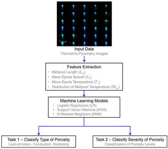 Smoqi et al. [80] employed a dual-wavelength pyrometer to detect porosity and assess its intensity. They fabricated a single sample with varying parameters at different levels and utilized XCT scans as the ground truth for their experiments. The dual-wavelength pyrometer was utilized to account for changes in thermal emissivity. This was achieved by measuring radiation intensity at two different wavelengths, allowing for the estimation of the temperature of the object. In comparison to temperature measurements obtained using an infrared thermal camera or a single-wavelength pyrometer, the dual-wavelength imaging pyrometer used in this study provided a temperature measurement closer to the absolute melt pool temperature [80]. Various machine learning techniques were applied, including logistic regression (LR), support vector machine (SVM), K-nearest neighbors (KNNs), and convolutional neural network (CNN). Among these techniques, KNN yielded favorable results compared to others, demonstrating a 95% confidence level. The schematic representation of the workflow is depicted in Figure 7.
