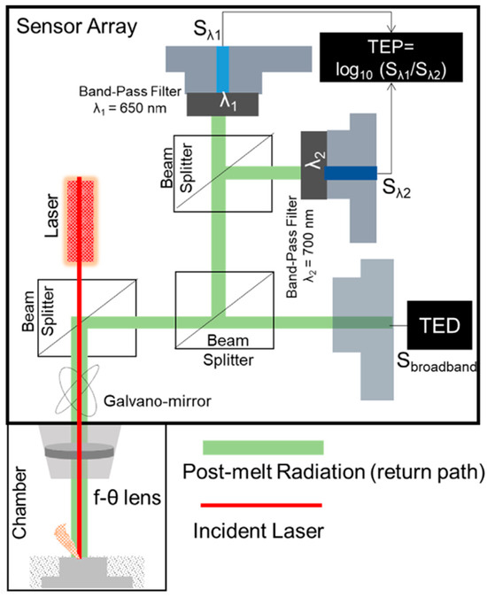Schematic representation of the dual pyrometer setup. The diagram illustrates the instrumented on-axis sensor configuration for an EOS M290 LPBF system. The system comprises three photodetectors. Thermal Energy Planck (TEP) signatures are obtained by bandpass filtering two of the photodetectors. The third photodetector, which is unfiltered, measures the Thermal Energy Density (TED), capturing broadband emissions from the chamber. Reprinted with permission from ref. [82], 2020, Elsevier Ltd.