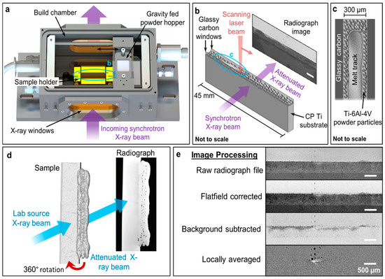 (a) An experimental construction chamber with labeled components. (b) A simplified outline of the sample container during in situ melting. (c) Schematics of the substrate, powder particles, and melt track. (d) Schematic of the μCT sample scan. (e) Techniques for image processing. Reprinted with permission from ref. [99], 2020, Elsevier Ltd.
