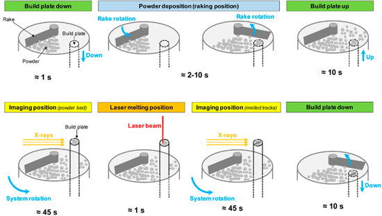 - Lhuissier, P.; Bataillon, X.; Maestre, C.; Sijobert, J.; Cabrol, E.; Bertrand, P.; Boller, E.; Rack, A.; Blandin, J.-J.; Salvo, L.; et al. In Situ 3D X-Ray Microtomography of Laser-Based Powder-Bed Fusion (L-PBF)—A Feasibility Study. Addit. Manuf. 2020, 34, 101271. [Google Scholar] [CrossRef]