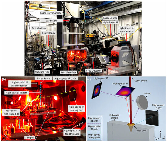 Multi-sensor set up involving high-speed IR and X-ray camera. (a) Equipment arrangement at Beamline 32-ID-B, APS, Argonne National Laboratory. (b) Design of the testing room at Argonne National Laboratory’s Beamline 32-ID-B, APS. (c) Diagram showing the viewing angles for high-spatial, high-speed IR, and high-speed X-ray imaging, illustrating an increase in aspect ratio. Adapted from Ref. [103].