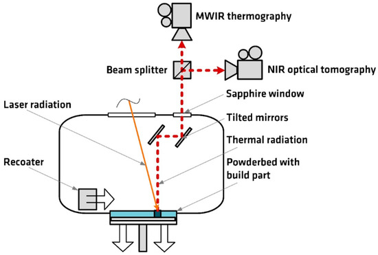 Mohr et al. [49] employed a mid-wave infrared camera and a near-infrared camera to monitor the L-PBF system. The mid-wave camera collected data at a rate of 900 Hz. Optical tomography was utilized to collect single-image data for each layer, with an extended exposure time. The system setup is depicted in Figure 14. Micro CT served as the ground truth for defects larger than 14 microns. Process variations were identified and correlated with LOF void clusters using the time-over-threshold (TOT) concept, employing non-calibrated thermography temperatures. This approach provided insights into the L-PBF system, offering a comprehensive understanding of defects and process variations.