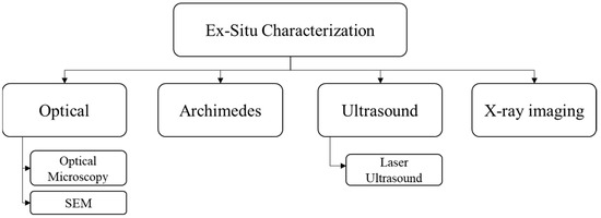 The post-characterization of AM-fabricated samples has been subjected to thorough investigation, given the ease of application of conventional quality control measurements. Two primary methods are employed to identify porosities in L-PBF: destructive and non-destructive techniques. In destructive porosity measurements, coupons are harvested by slicing the sample. The harvested coupon is then ground and mirror-polished for imaging purposes. Optical microscopy and/or electron microscopy are common imaging techniques utilized in this context. This rigorous examination allows for a detailed analysis of porosities and provides valuable insights into the quality of the AM-fabricated components. A schematic representation of ex situ characterization methods capable of detecting porosities and defects in metal LPBF is illustrated in Figure 15.