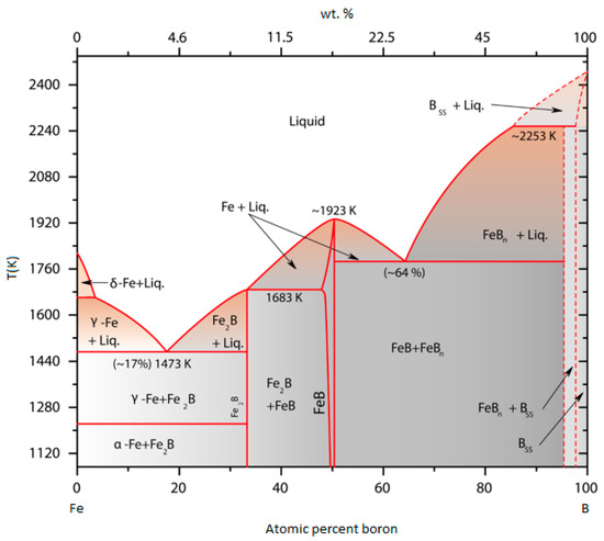 A very interesting and much more complete work is the one presented by Akopov et al. [11], which reviews the advances in the crystal chemistry of the different boronizes in the last 60 years and compiles data on the crystal structure, material properties, and synthetic routes of metal boronizes. Likewise, metal boronizes are chosen because of their rich crystalline chemistry, which gives rise to several properties that offer many application possibilities. The formation of a boronize coating on iron and steel can result in a single-phase or two-phase composition, which is determined by the Fe-B phase diagram (refer to Figure 1) [12].