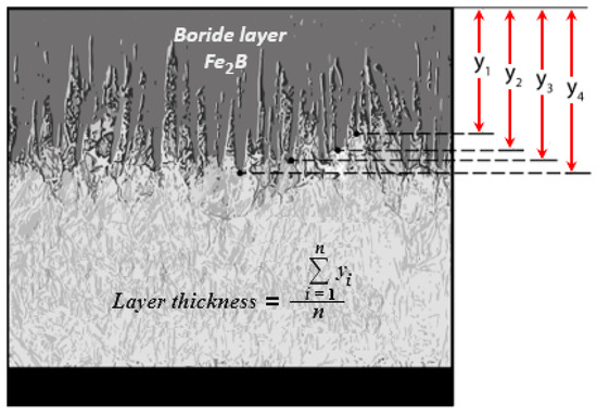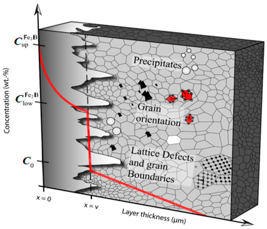 The data presented in Figure 2 indicate that the boron concentration at the phase surface is denoted as (=9 wt.%B), while the boron concentration at the Fe2B/substrate growth interface is represented as (=8.83 wt.%B). Additionally, the boron solubility limit within the substrate is symbolized as (=35 × 10−4 wt.%B), though it cannot be considered due to its magnitude [12]. It is essential to note that the information presented in Figure 2 is critical for understanding the boron concentration at the phase surface and the Fe2B/substrate growth interface. Therefore, the data can provide valuable insights into the growth process of Fe2B on the substrate.
