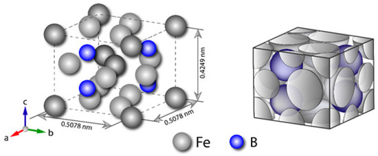 - The crystal structure of Fe2B is identified as body-centered tetragonal and is characterized by axial lengths a = b = 0.5078 × 10−9 m and c = 0.4249 × 10−9 m (as exemplified in Figure 3).