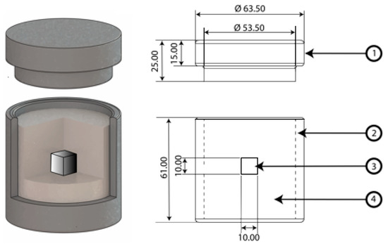 Schematic illustration and cross-sectional view of the AISI 316L stainless steel cylindrical vessel utilized for the pack-boronizing treatment. The cylindrical vessel comprises four distinct components: (1) a lid equipped with a hole for the release of gases generated as a result of the chemical reaction of the mixture, (2) a boron-rich salt mixture consisting of B4C, KBF4, and SiC, (3) an embedded test tube utilized for hardening, and (4) the cylindrical vessel itself. The dimensions of the vessel are specified in millimetres.