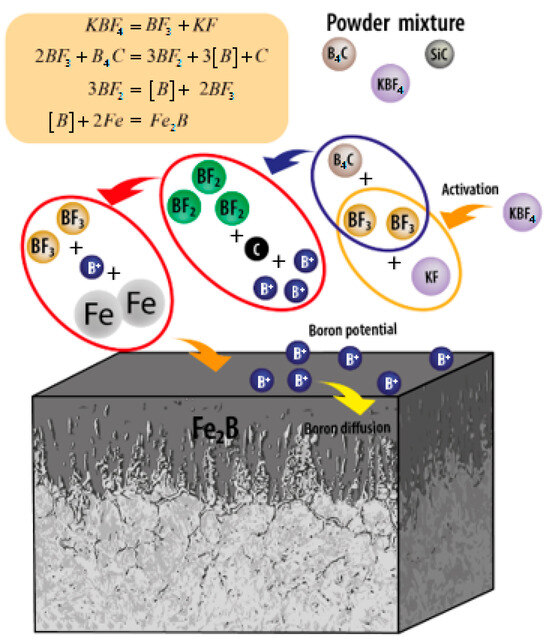 The chemical mixture has the following weight percentage composition: 33.5% boron carbide (B4C) as the main boronize, 5.4% potassium fluoroborate (KBF4) as the catalyst, and 61.1% silicon carbide (SiC) as the diluent. This specific composition of the boronize powder facilitates the formation of a Fe2B-type boronize monocoating on the treated surface, as cited in [20]. Chemical reactions that form the Fe2B coatings are shown in Figure 5, as referenced by [21].