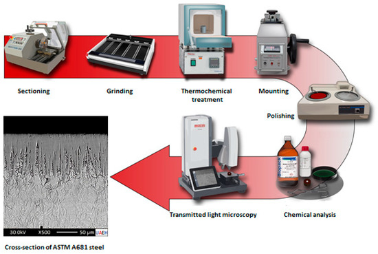 According to the phase diagram, the boronizing treatment temperatures (refer to Figure 1) ranged from 1123 K to 1273 K, while the treatment duration ranged from 2 to 8 h. After completion of the boronizing process, the container was removed from the oven and allowed to cool to room temperature (296 K). The sample was then removed from the container and encapsulated in resin using a Buehler SimpliMet 4000 mounting press (Lake Bluff, IL, USA). This encapsulation was carried out to facilitate sample holding during manual polishing. It was chosen based on the shape of the part and the type of analysis to be performed, including edge analysis as part of a surface treatment. The metallographic samples underwent a rigorous two-step polishing process. Firstly, the samples were polished with a Buehler MicroCloth™ (Hong Kong, SAR, China), a soft, versatile, synthetic rayon cloth with a long pile and magnetic backing. The cloth was used with Al2O3 aluminium oxide abrasive (3 and 1 × 10−6 m) to remove any scratches that may have been produced during the roughing operation. Secondly, with each size, the samples were subjected to diamond suspension polishing (0.25 and 0.05 × 10−6 m, Buehler) for 20 min. This allowed for the creation of a specular surface necessary for accurate analysis. Additionally, the samples were cleaned after each step using an ultrasonic bath of acetone for thirty seconds to ensure the highest possible quality. A reagent was employed in immersion with 4% volume Nital to reveal and analyze the samples’ microstructure. The thickness of the boronized coatings was observed using a 4K optical microscope from the VHX-7000 series (Higashi-Yodogawa-ku, Osaka, Japan). The metallographic procedure, including the observation of phases, grain boundaries, impurities, and deformation zones, is presented in Figure 6.